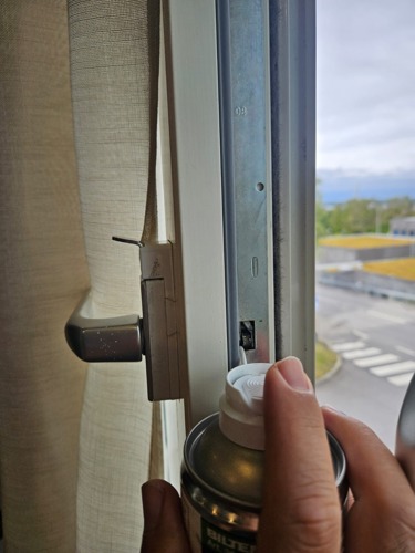 Det har inkommit flera felanmälningar för att fönstren i badrummet inte längre går att stänga ordentligt. Därför vill vi påminna om att det är viktigt att smörja fönstrens gångjärn och rörliga beslag regelbundet, gärna minst några gånger per år, så att de inte blir stela och riskerar att gå sönder. Se gärna på bilderna nedan för att se var ni kan spraya och med vilken typ av smörjmedel som passar.
